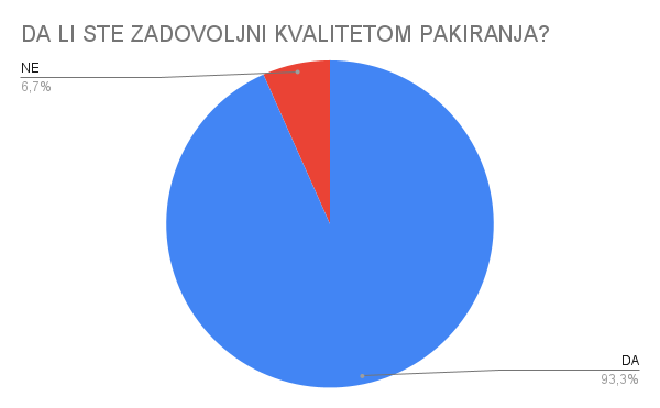 Također nas je zanimalo da li su kupci zadovoljni kvalitetom pakiranja. Iz priloženog grafikona možemo vidjeti da je 93,3% kupaca zadovoljno kvalitetom pakiranja, a 6,7% nije zadovoljno.