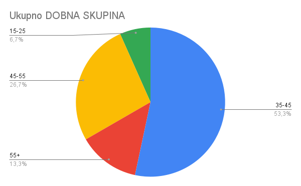 Najveći broj naših kupaca spada u dobnu skupinu od 35 do 45 godina te time čine 53,3% svih kupaca. Slijede ih dobne skupine od 45 do 55 godina sa 26,7%, 55+ godina sa 13,3% te od 15 do 25 godina sa 6,7% udjela.