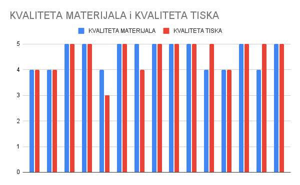 Ova pitanja su nama, a vjerujemo i kupcima, najbitnija. I slobodno možemo reči da smo veoma zadovoljni sa ocjenama. Prosječna ocjena za kvalitetu materijala i tiska je 4,6.