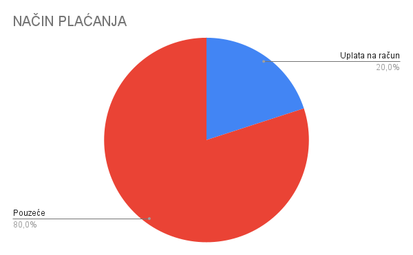 Na pitanje koji način plaćanja preferiraju, 80% kupaca izjasnilo se je da preferiraju plaćanje pouzećem, a 20% preferira uplatu na račun putem bankovne transakcije.