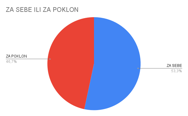 U ovom pitanju zanimalo nas je da li su kupci naše proizvode kupovali za sebe ili za poklon dragoj osobi? Malo više od polovice, 53,3% kupaca je kupovalo za sebe, a 46,7% za poklon.