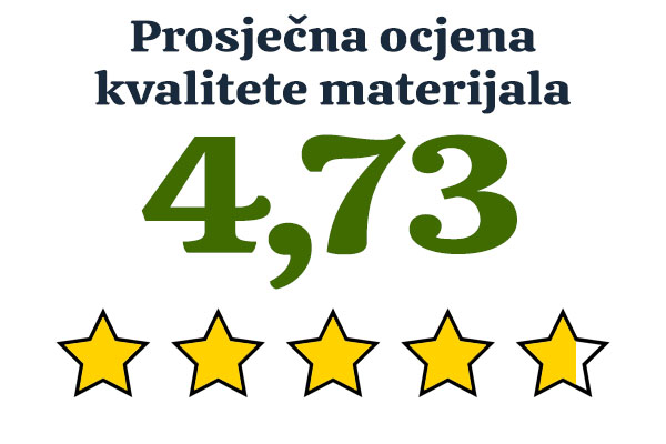 - Materijal: 35 kupaca ocijenilo je materijal ocjenom 5, 10 ih je dalo ocjenu 4, a jedan kupac je materijalu dao ocjenu 3. Prosječna ocjena: 4,73